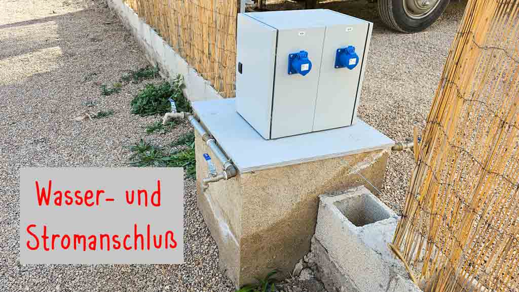 Der Strom wird weitestgehend mit stellplatzeigenen Solarmodulen erzeugt. An jedem Platz befindet sich ein kleiner abschließbarer Kasten mit jeweils einer CEE Steckdose, bei der eine Leistung von 3500W zur Verfügung gestellt wird und die mit 16A abgesichert ist.
