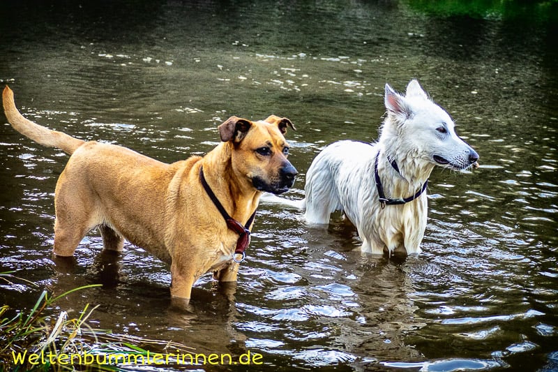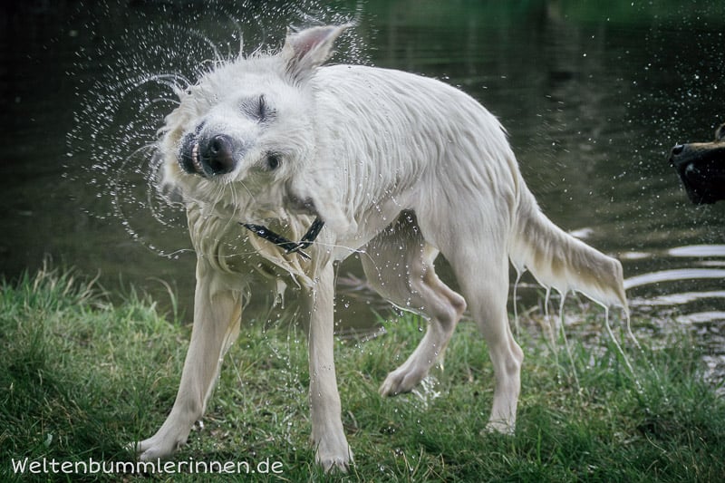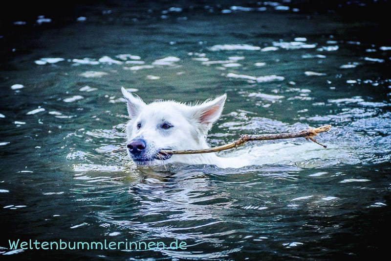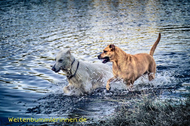 Hier kann Luna nach Herzenslust mit ihrer Freundin Emmi herumtollen und viele viele Stöckchen aus dem See retten. Ob sie nun gerettet werden wollten, oder nicht, ist dabei ziemlich egal. Wir jedenfalls müssen jedesmal vor der wassertriefenden Luna flüchten, wenn sie dem See entsprungen ist, denn dann schaffte sie es, rasensprengergleich, mindestens 4 qm Fläche ordentlich zu beregnen.