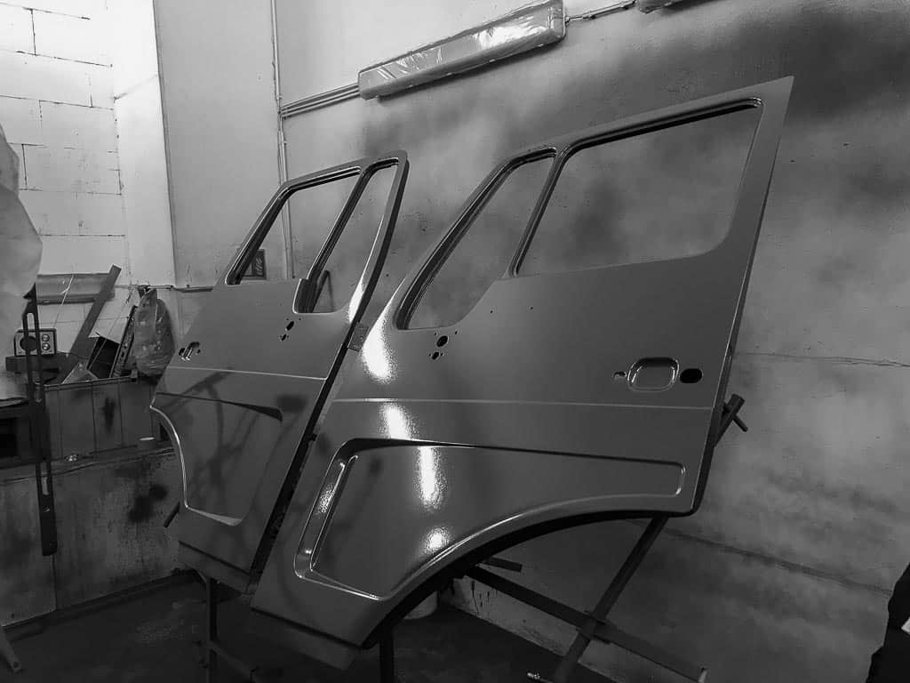 Unser Autochen genießt eine ausgiebige Wellnessbehandlung in der Werkstatt von 4Wheel24. Währenddessen werden im Koffer Fenster, Tür und Klappen eingebaut.