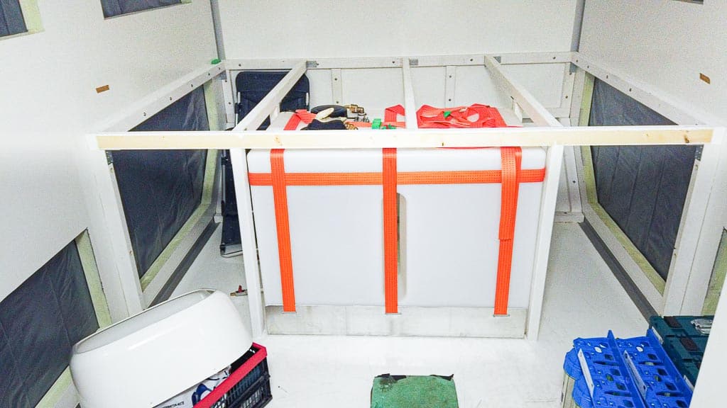 Das Herzstück unserer Wasserfilteranlage im Wohnmobil: Die Wassertanks unter dem Bett im Frühstadium unseres Ausbaus. Gesichert durch eine flächig verklebte, gebogene Aluminiumplatte und festgezurrt mit Spanngurten.
