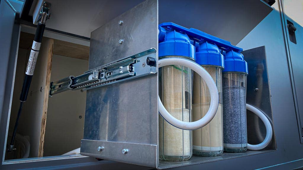 Das Verstecken des Wasserfilters und der Pumpe unter der Spüle hat sich in unserem kompakten Wohnmobil ebenfalls als unpraktisch erwiesen. Es fühlt sich an, als müsse man sich wie ein Käfer zusammenrollen, um an die Anlage zu gelangen. Der Filterwechsel in einer feuchtigkeitsempfindlichen Umgebung?