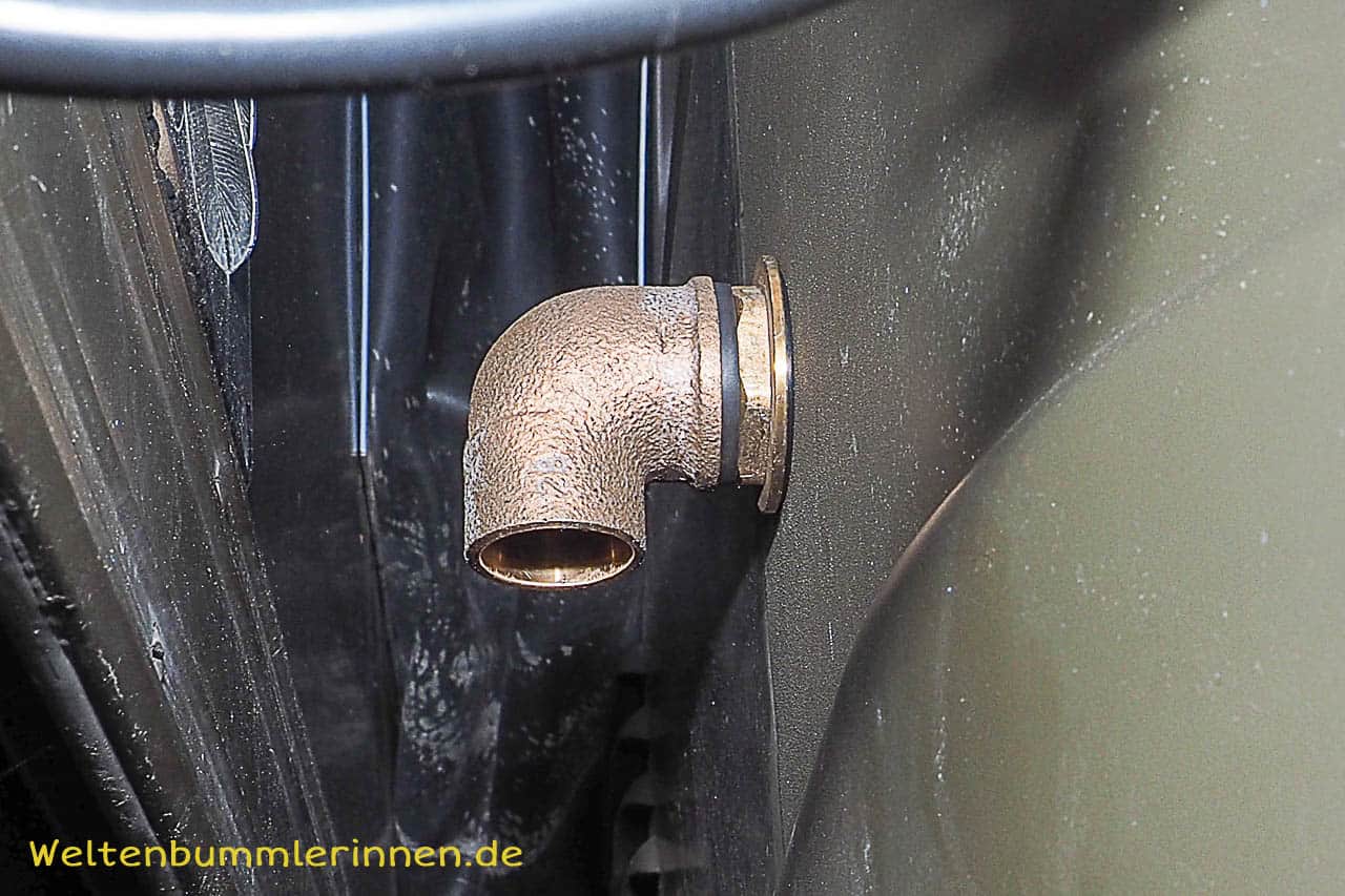 Auf der Außenseite wurde einfach ein Schlauch mittels Schelle auf einem Stück PE-Rohr befestigt, welches in der Anschlußbuchse steckte.