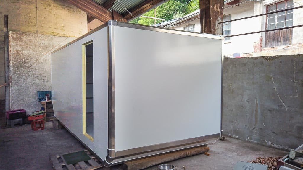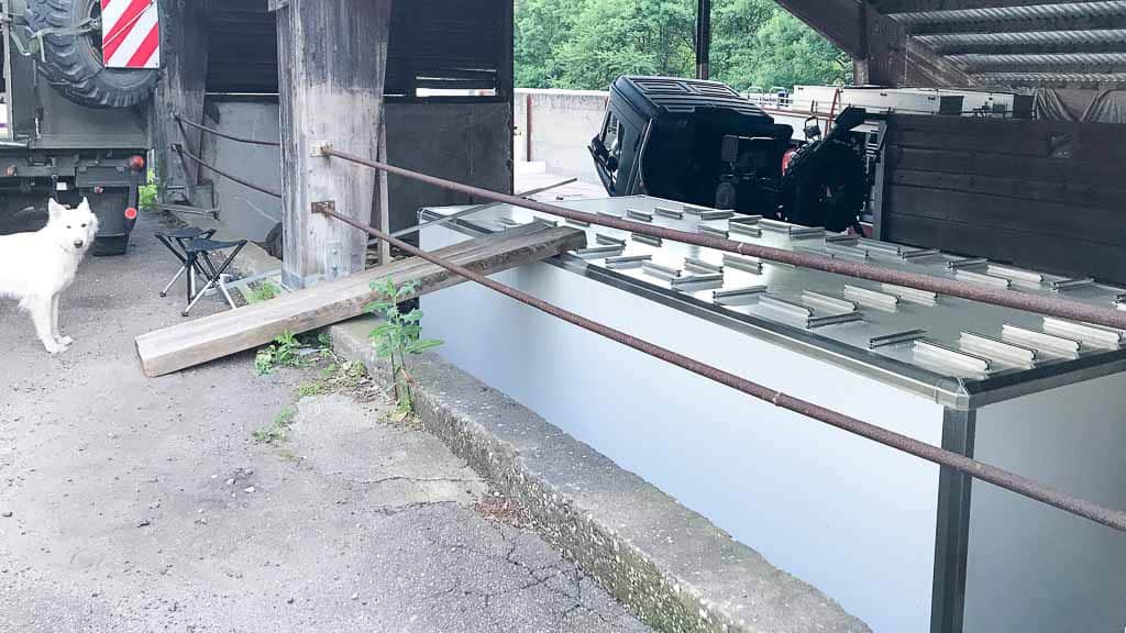 Mit Anhänger und Stapler wurde unser Koffer nun an den Ort gebracht, an dem wir ihn ausbauen können. Überdacht, weitestgehend regensicher und halbwegs geschützt vor der mörderischen Hitze, die in einigen Wochen kommen wird.