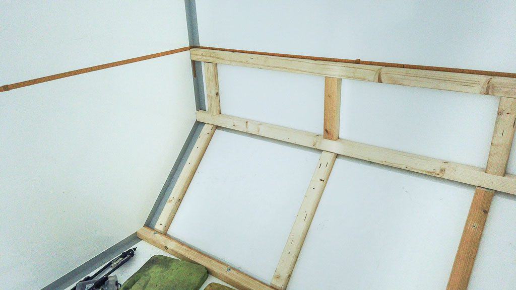 Nachdem die Arbeiten an den Wassertanks erst einmal abgeschlossen waren, machen wir uns daran, das Bettgestell zu konstruieren. Da unser Kofferheck abgeschrägt ist, fabriziert es uns doch einige Knoten im Hirn, doch letztendlich passen alle Winkel zusammen und wir können bald weiterbauen.