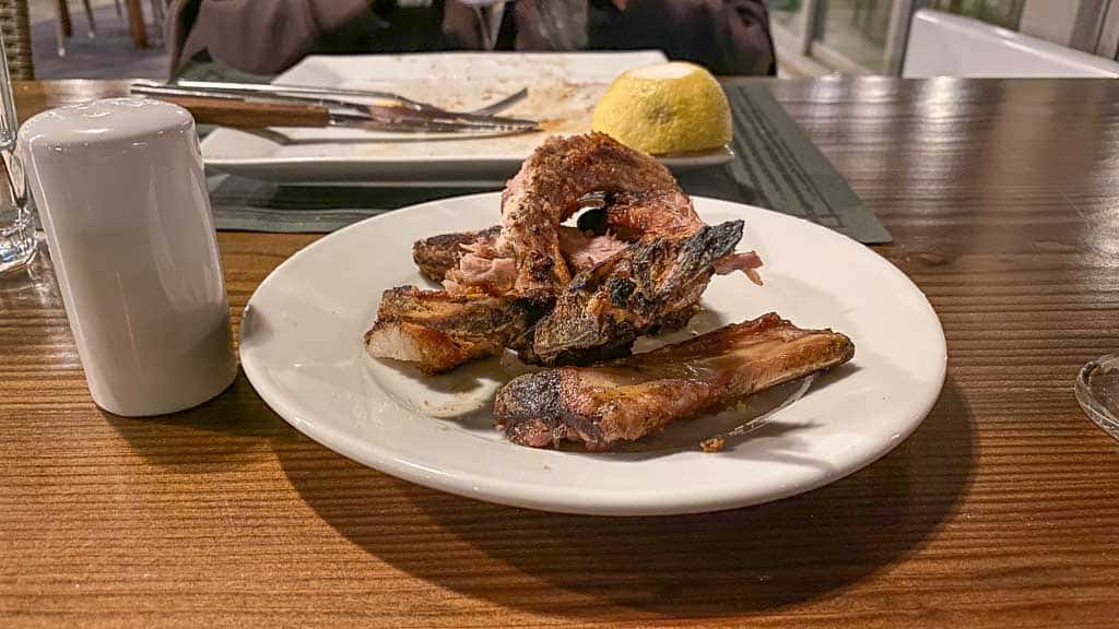 Beim Essen fällt uns auf, dass alle immer Essensfotos teilen. Wir schaffen das nie! Denn wenn uns das Teilen von Essensfotos einfällt, haben wir immer bereits alles aufgegessen. Mist. Aber heute haben wir Glück, dass auch ein paar Knochen bei unserem Grillteller dabei waren, so können wir wenigstens die fotografisch festhalten