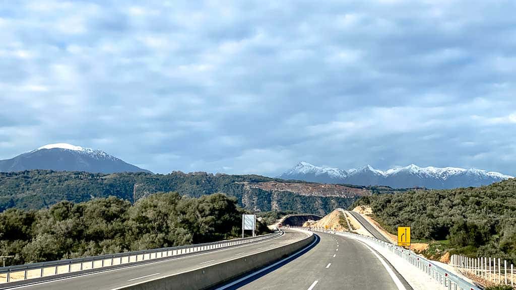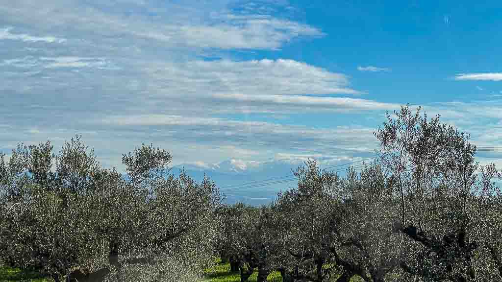 Wie dem auch sei. Bei unserer Fahrt sehen wir in der Ferne, an Olivenhainen vorbeifahrend, die weißbekappten Berge Griechenlands.