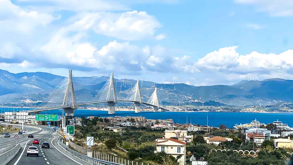 Wir passieren die Rio-Andirrio-Brücke. Wie man nachlesen kann, erregte sie bei ihrem Bau im Jahr 2004 Aufsehen, weil es lange für unmöglich gehalten wurde, eine Brücke in einem Erdbebengebiet über eine 2,5 km breite und 65 m tiefe Meerenge ohne stabilen Boden zu bauen.