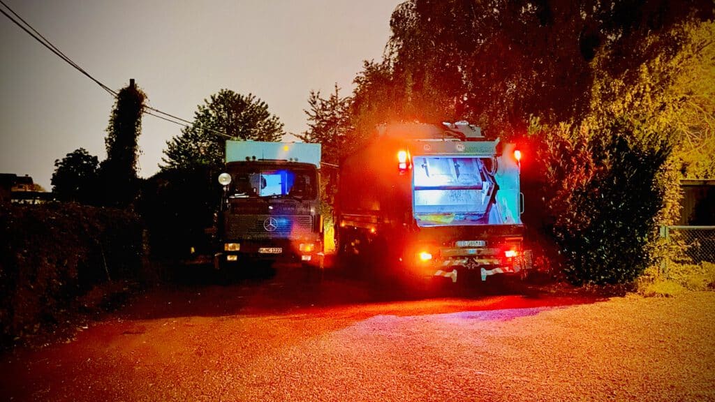 Der erste Morgenkaffee ist schnell getrunken und wir sind schon bereit zum weiterfahren. Da kommt doch ein anderes, kleineres Fahrzeug angefahren und lädt Müllsäcke in den großen LKW um.