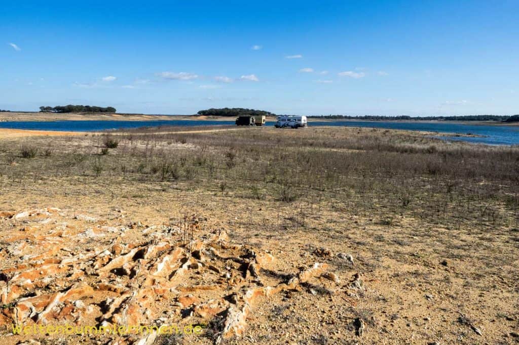 Nach einigen Tagen, gefüllt von Jubel, Trubel, Heiterkeit, Lagerfeuermusik und -gesängen zieht es uns weiter zu einem kleinen Stausee, wo wir, zumindest wenn man die Örtlichkeit in Google Maps betrachtet, etwas erhöht mitten im Stausee stehen. Natürlich haben wir unser Fienchen zwischenzeitlich nicht zu einem Amphibienfahrzeug umgebaut, sondern befinden uns, bedingt durch den chronisch niedrigen Wasserstand des Stausees auf einer kleinen Insel, die jetzt allerdings über Landwege zu erreichen ist.